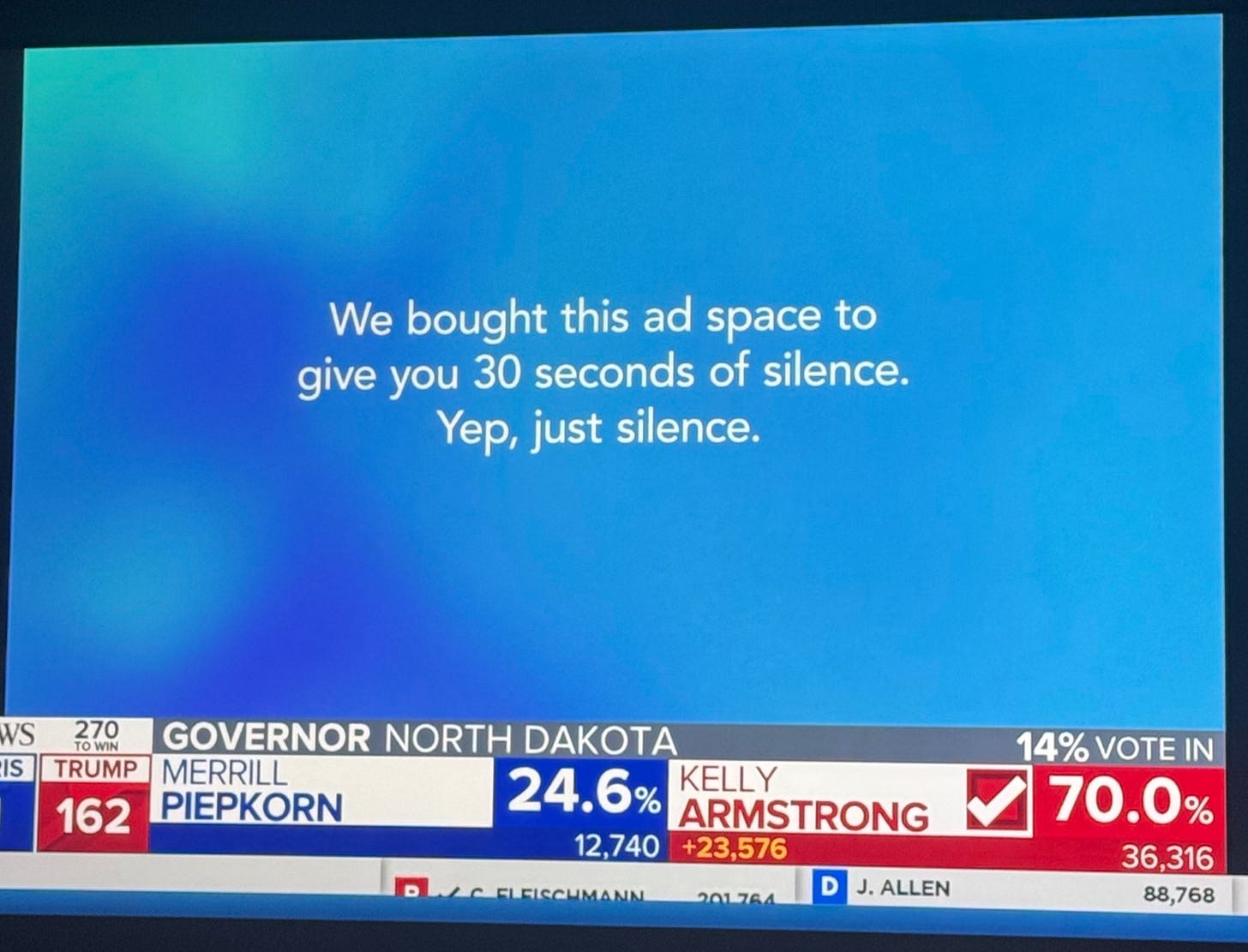 Calm, l’app per la meditazione, ha comprato un costosissimo spazio televisivo di 30 secondi durante il frenetico spoglio elettorale USA. Lo spot conteneva questo messaggio e un invito al silenzio. Geniale!