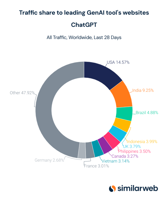ChatGPT riceve molto traffico da USA, India, Brasile e Indonesia. Poco dall’Europa. L’Italia è residuale. Dati simili per Gemini, Perplexity e Claude.