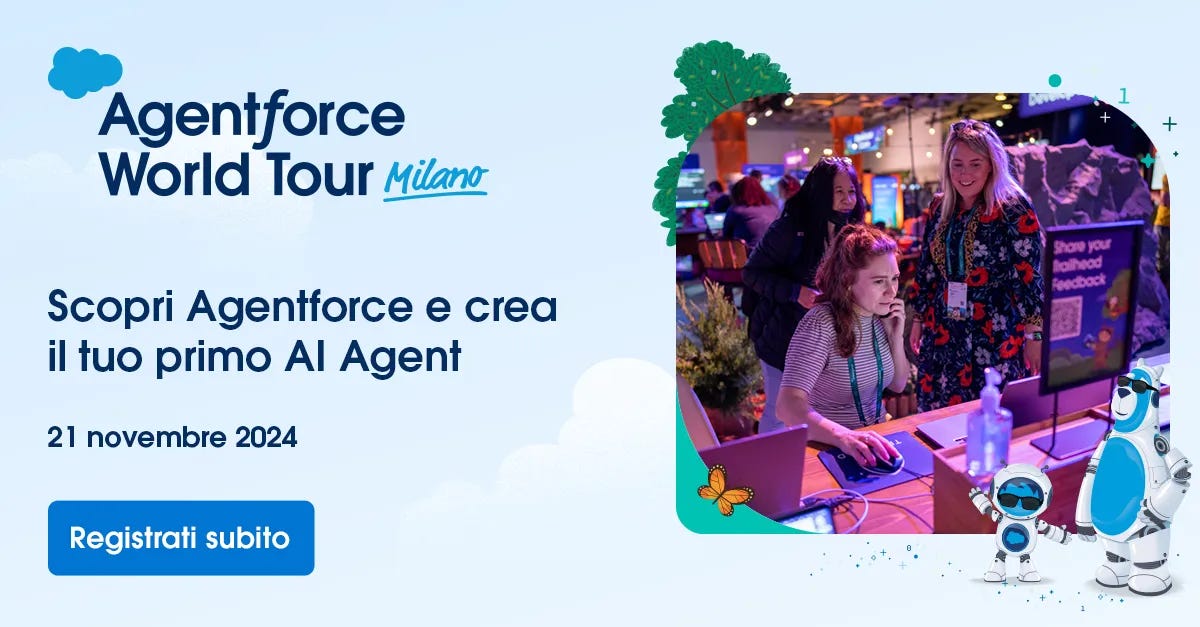 Sei vuoi scoprire il futuro dell’Intelligenza Artificiale, giovedì 21 novembre 2024, arriva a Milano Agentforce World Tour (presso Superstudio Maxi). Potrai vedere come funzionano gli agenti IA che lavorano 24/7, automatizzando compiti, prendendo decisioni intelligenti e migliorando l'esperienza dei tuoi clienti.