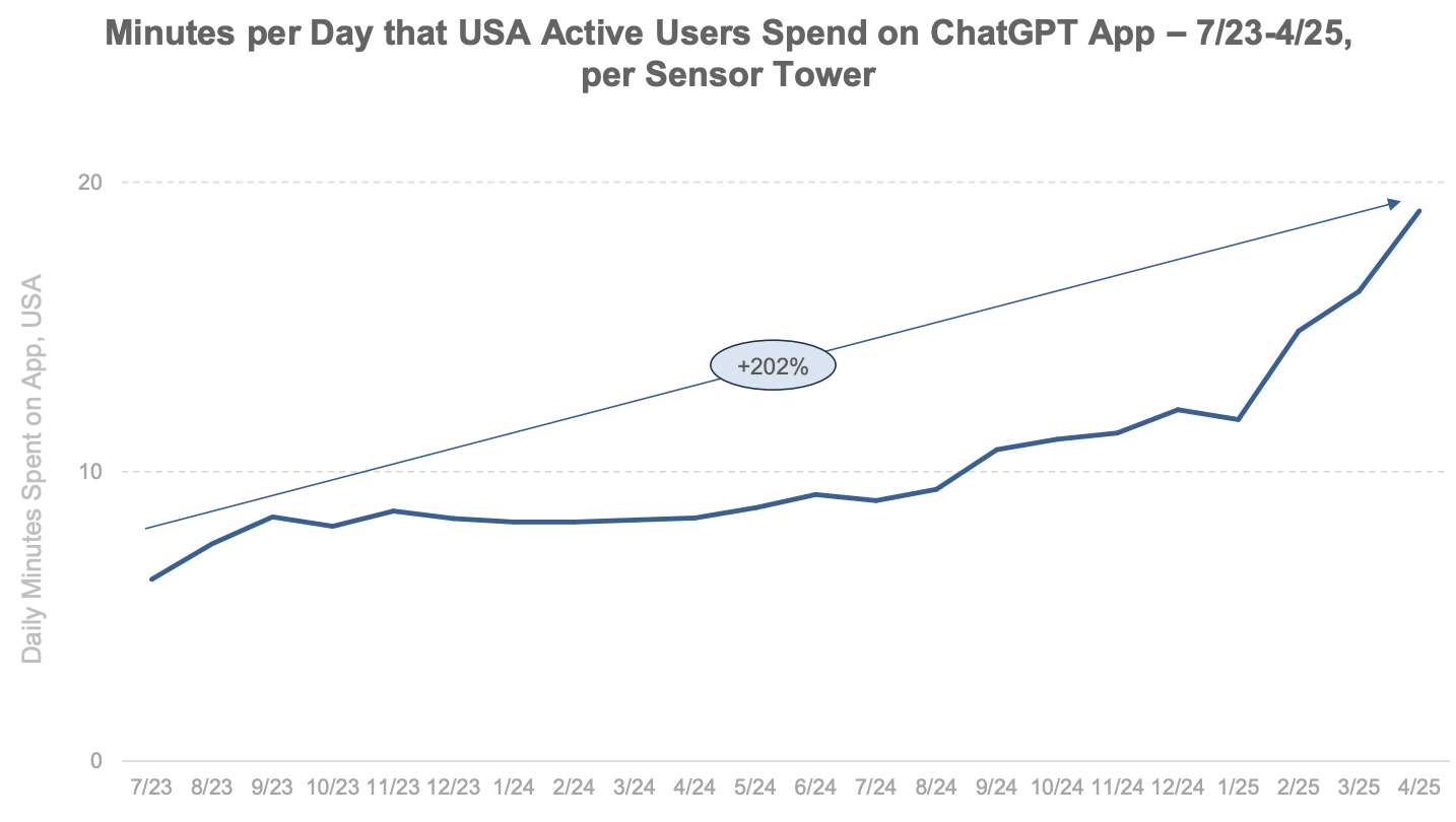 Mary Meeker, nota analista tech, ha messo insieme una presentazione di oltre 300 pagine sullo stato dell’IA, frutto di dati presi qua e là. Uno dei dati più interessanti è quello relativo alla crescita del tempo di utilizzo di ChatGPT che ora si avvicina ai 20 minuti al giorno per persona. Qui il pdf completo.