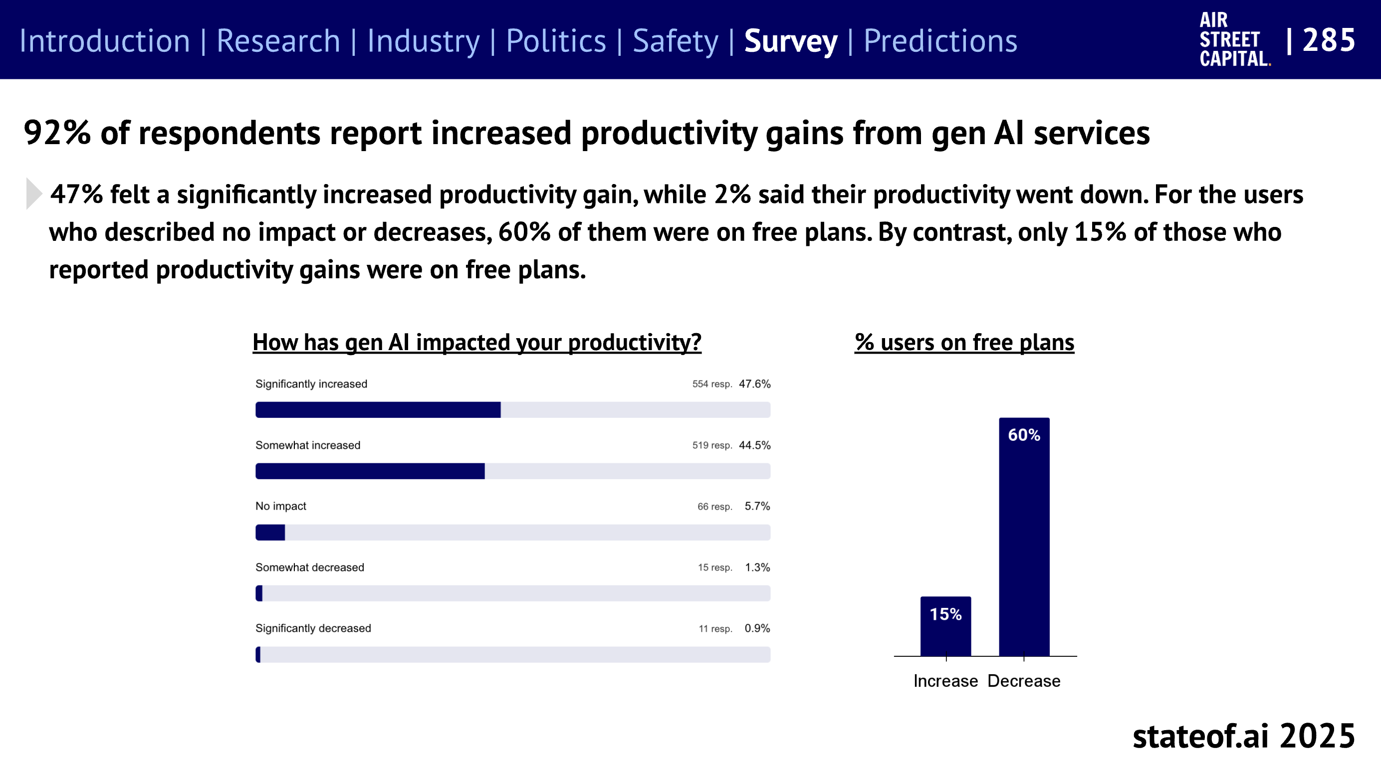 State of AI è un report monumentale riassuntivo dell’attuale livello dei sistemi di intelligenza artificiale, redatto da Nathan Benaich e Air Street Capital. Ci trovi anche un sondaggio su circa 1200 utilizzatori di tool IA che affermano di aver notato un incremento della loro produttività significativo (47,6%) o di qualche tipo (44,5%).